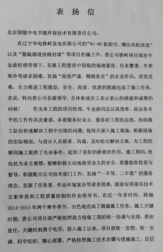 當(dāng)前位置: 國能中電公司動態(tài)> 公司遼寧華電鐵嶺EPC項目受業(yè)主表揚