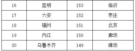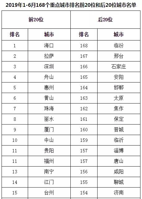 2019年1-6月,168個(gè)重點(diǎn)城市中臨汾、邢臺、石家莊市等20個(gè)城市空氣質(zhì)量相對較差(從第168名到第149名);??凇⒗_、深圳市等20個(gè)城市空氣質(zhì)量相對較好(從第1名到第20名,見附表2)。